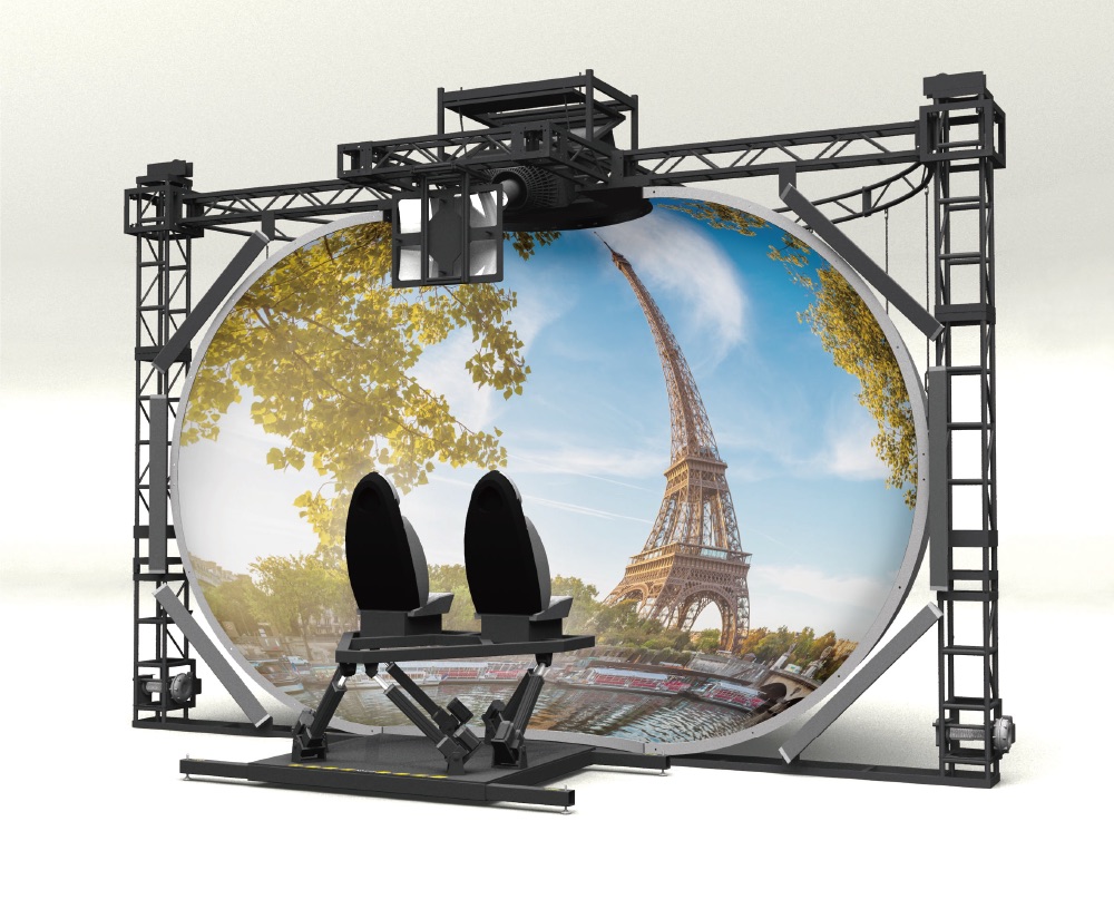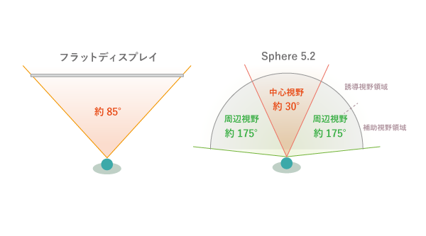 WV Sphere 5.2 は、幅 5.2m、高さ 3.4m、奥行き 2.6m の半球状スクリーンに 4 K または 8 Kの映像を映すことによって、